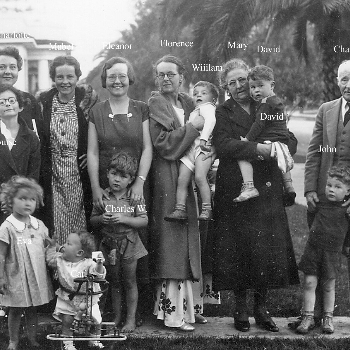 The Pettes Family in 1934. Florence Grace Pettes Thacker ( in the middle holding her son William) is my great-grandmother. Louise (far left in glasses) is my grandmother.
