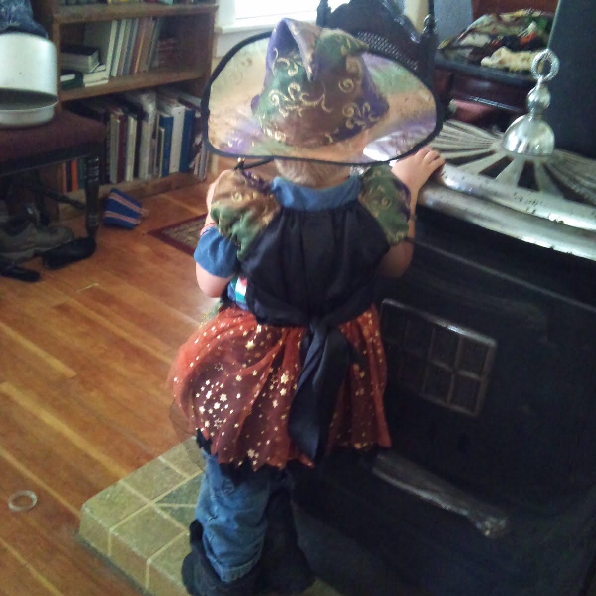 My little boy has really been into “dress up”. Every day he comes downstairs in a new outfit and has a new identity. Some days he is a train engineer, a robot, a spaceman, a pirate, and for awhile a witch… complete with the witch hat and dress.