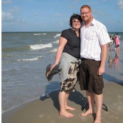 My name is Karin, I am 31-years-old and I live just outside the second largest city in Denmark. I moved here 12 years ago because I had just fallen in love with the city and less than a year after I came here I fell in love with my husband whom I met at work. We celebrated our ten year anniversary this summer and are still going strong. This is my husband and I on a windy day in the summertime at the beach in Skagen; the top of Denmark.p { }